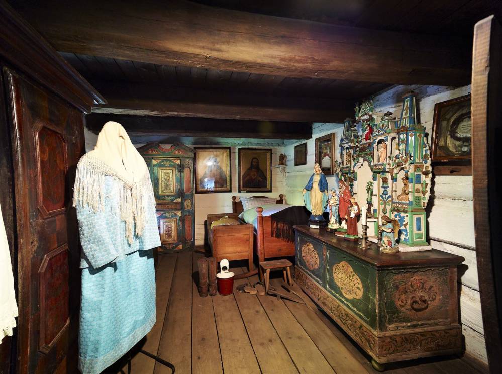 Pszczyna, Zagroda Wsi Pszczyńskiej, wnętrze izby paradnej chałupy z Grzawy, foto Tomasz Renk slaskie.travel
