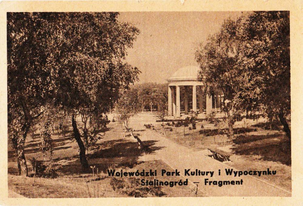 Chorzów, najstarsze freagmenty Wojewódzkiego Parku Kultury i Wypoczynku (Duży Krąg Taneczny) na starej pocztówce