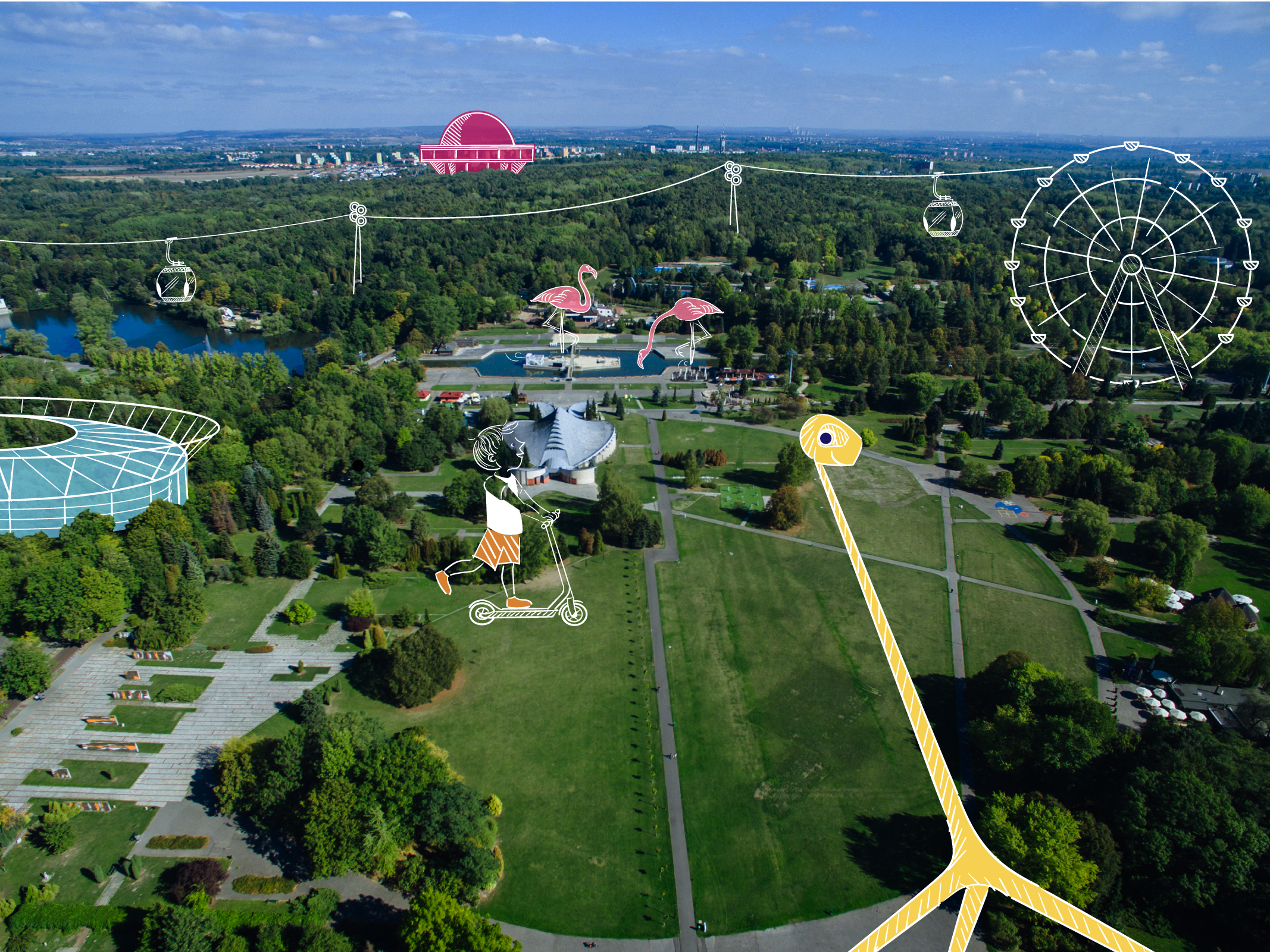 Dla większości z nas Park Śląski istniał od zawsze, chodziliśmy do niego z naszymi rodzicami i teraz prowadzimy tam swoje dzieci. W czasie letnich weekendów i tak park wypełnia się po brzegi, więc nie ma co reklamować tego miejsca. Tyle, że ja proponuję Państwu by spojrzeć na Park Śląski z zupełnie innej perspektywy. Popatrzeć z poziomu wzroku betonowej żyrafy, która wita nas niczym odźwierny przy głównym wejściu do parku. Z wysokości szesnastometrowej szyi, z kamiennym spokojem żyrafa spogląda na główną aleję widokową parku prowadzącą do ogrodu zoologicznego, obserwuje kwiaty w ogrodzie różanym - Rosarium, kontroluje układ ścieżek w ogrodzie japońskim, sprawdza jak dzieci trenują tenisa na kortach i rzuca okiem jeszcze dalej, na młodzików grających w piłkę na Stadionie Śląskim. Przygląda się restauracjom, kawiarenkom z lodami, uśmiechniętym dzieciakom na rollercoasterze i patrzy na pomnik Mikołaja Kopernika, który przystanął w najwyższym punkcie parku, tuż przed Planetarium Śląskim. Gdyby kamienna żyrafa potrafiła myśleć, na pewno żyłaby w przekonaniu, że ktoś to wszystko kapitalnie zaprojektował. Przed nami miejsce porównywalne swoim założeniem do największych parków miejskich nie tylko w Europie, ale i na świecie. I nie ma w tym zdaniu ani odrobiny przesady. Otóż w 1952 r. wyrasta park, który swoim rozmachem wcale nie odstaje od innych znanych parków.