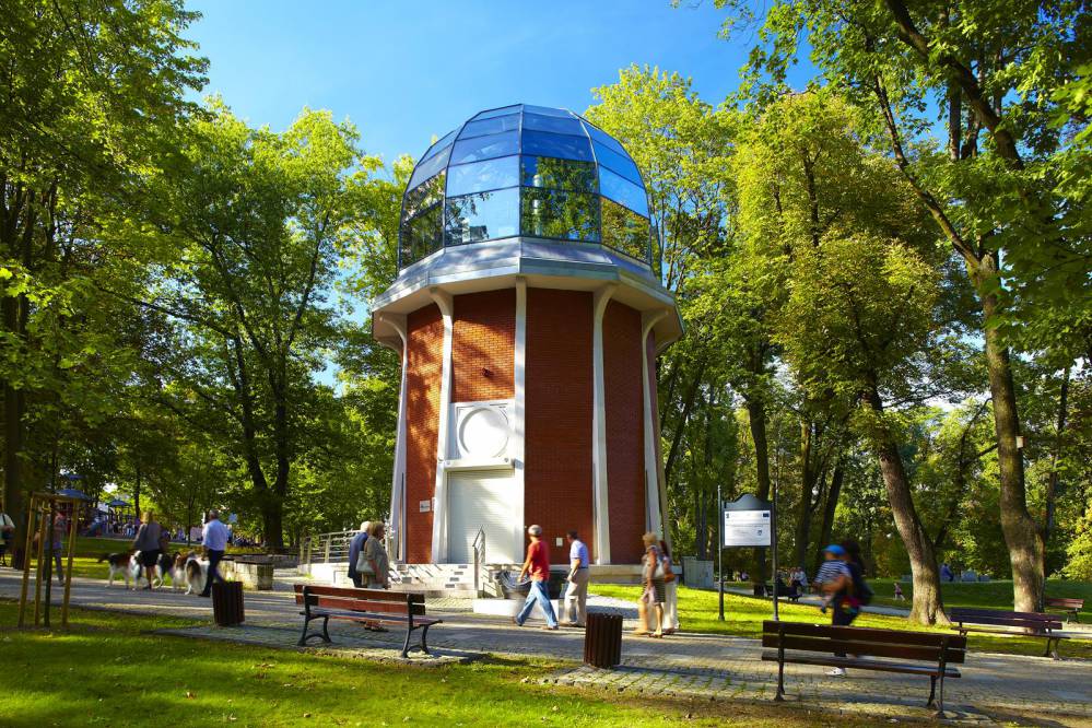 Wracamy do głównej alejki, skręcamy w prawo. Po kilkudziesięciu metrach, po lewej, modernistyczny budynek na planie koła, nakryty półkolistą kopułą, zbudowany w 1909 r. W okresie międzywojennym zaadoptowany został na obserwatorium astronomiczne. W wyremontowanym budynku w 2010 r. urządzono interaktywny świat zabawy i nauki dla dzieci i młodzieży. To też obiekt Muzeum Częstochowskiego – MULTICENTRUM „ZODIAK” (budynek jest 3-poziomowy, przy wejściu podjazd, dostępna winda, toaleta dla osób niepełnosprawnych znajduje się na kondygnacji 0). W obiekcie realizowane są zajęcia głównie dla dzieci. Idziemy dalej główną alejką. Po 250 m, po lewej, stoi pomnik Stanisława Staszica. Wychodzimy z parku w Al. Najświętszej Maryi Panny. Wygodnym szerokim deptakiem między jezdniami wędrujemy w stronę Ratusza.