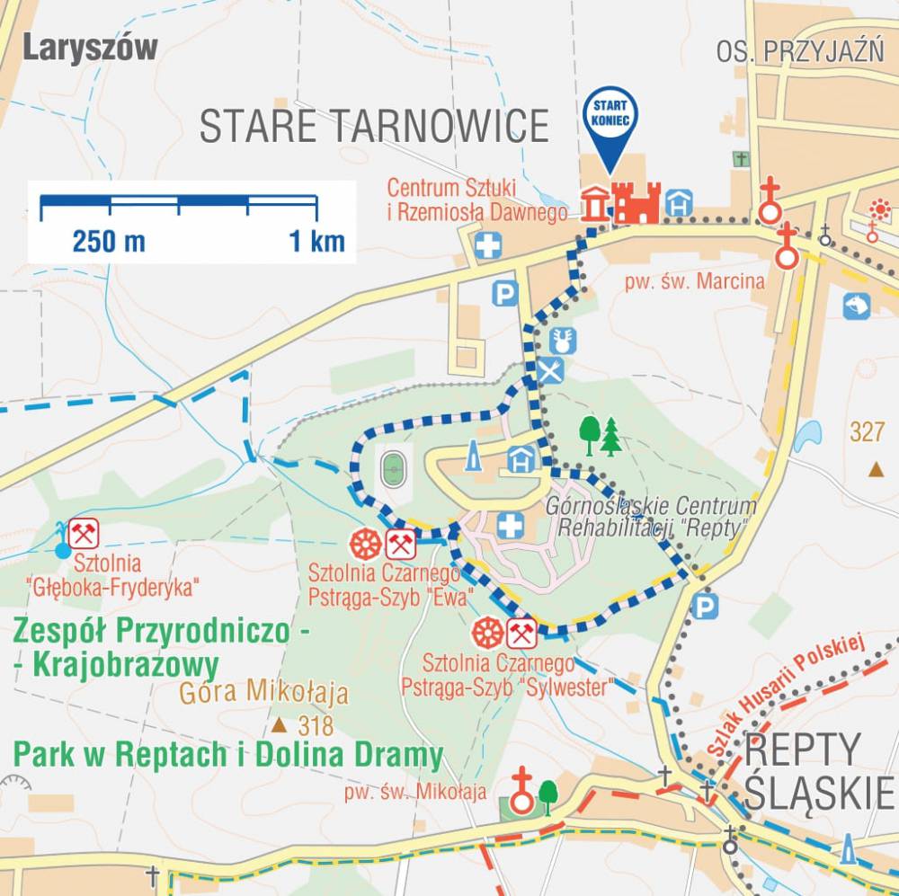 Wychodzimy z Kompleksu Zamkowego przez bramę przy parkingu. Naprzeciw bramy ulica prowadząca do PARKU W REPTACH. Prowadzony nią jest też rowerowy Szlak Gwarków. Dochodzimy po 500 m do ul. Śniadeckiego, skręcamy w lewo. Po 550 m docieramy do ronda. Jesteśmy w centrum Parku Repeckiego. Kompleks leśny leżący pomiędzy Starymi Tarnowicami a Reptami wchodzi w skład ustanowionego na tym obszarze zespołu przyrodniczo-krajobrazowego. Jest to największe na Górnym Śląsku i jedno z najbardziej interesujących skupień drzew pomnikowych w Polsce. Rośnie tu 110 drzew kwalifikujących się do objęcia ochroną, jako pomniki przyrody. Na rondzie skręcamy w lewo. Wędrujemy asfaltową ścieżką przez 700 m, do skrzyżowania z żółtym pieszym Szlakiem Gwarków. Przy skrzyżowaniu stoją tablice informacyjne i jest parking. Na skrzyżowaniu skręcamy w prawo i idziemy ok. 600 m wąską ścieżką o nawierzchni asfaltowej do SZYBU „SYLWESTER” SZTOLNI CZARNEGO PSTRĄGA, najdłuższej tarnogórskiej sztolni odwadniającej kopalni „Fryderyk”, wydrążonej w latach 1821-1834. W sztolni na głębokości 20 m zaczyna się trasa turystyczna, którą pokonuje się… łodziami. Niestety, ze względu na schody prowadzące w głąb sztolni trasa jest niedostępna dla osób na wózkach. Podczas wycieczki podziwiać można uroki podziemnego świata m.in. stalaktyty i oryginalne partie chodnika sztolniowego wykutego w skale dolomitowej.