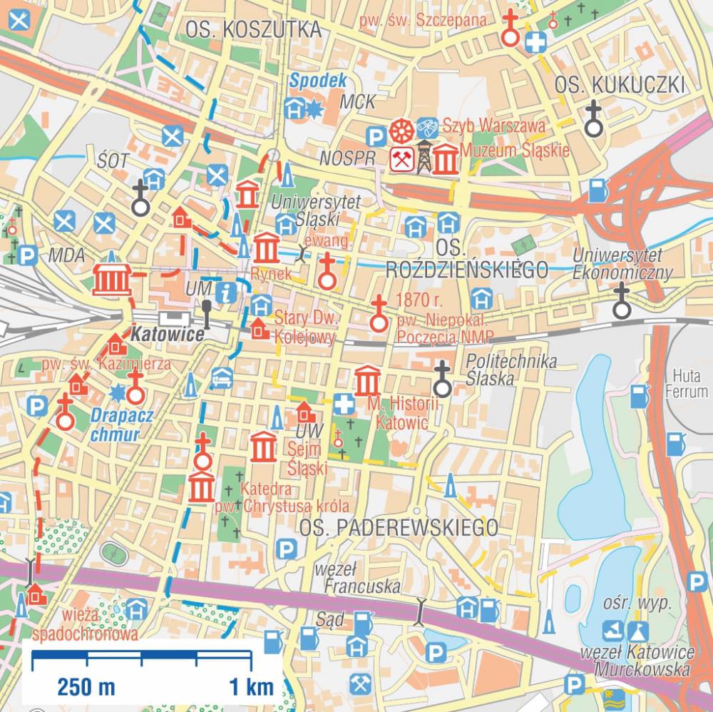 WSZYSTKIE WYŻEJ WYMIENIONE BUDYNKI SĄ ARCHITEKTONICZNIE DOSTĘPNE DLA OSÓB Z OGRANICZENIAMI RUCHU, PODOBNIE JAK PRZESTRZEŃ SPACEROWA ORAZ PARKINGOWA POMIĘDZY NIMI. Śródmieście Katowic posiada wiele udogodnień dla osób poruszających się na wózkach, dlatego spacer zarówno po południowej części miasta Szlakiem Moderny, jak i przemieszczanie się po Strefie Kultury można zaplanować w zasadzie dowolną trasą, jednak turyści z niepełnosprawnościami powinny mieć przy sobie asystenta, który w trudniejszych momentach zapewni odpowiednią pomoc. Poniżej przedstawiamy plan centrum Katowic z naniesionymi najciekawszymi miejscami w Śródmieściu.
