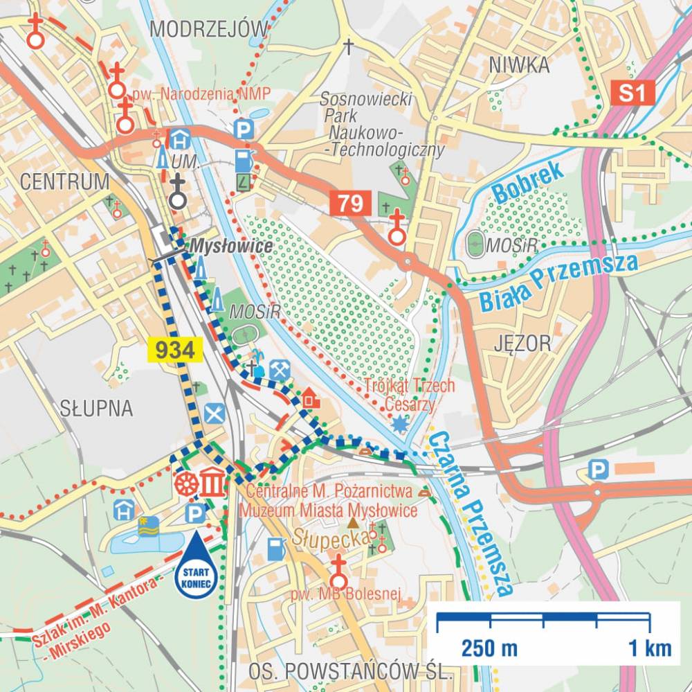 Wychodząc z muzeum skręcamy w prawo i wędrujemy, idąc za znakami zielonego szlaku pieszego. Z ul. Stadionowej skręcamy w prawo w ul. Oświęcimską, przechodzimy po pasach na drugą stronę ulicy, dochodzimy do ul. Portowej, skręcamy w lewo, przechodzimy przez tunel. Uwaga: niebezpieczne miejsce, brak chodnika. Za tunelem skręcamy w prawo w ul. Żeromskiego. Po 500 m od tunelu dochodzimy do małego placu o nawierzchni gruntowej. Poniżej zbieg rzek Czarnej i Białej Przemszy, historyczny styk granic trzech cesarstw z okresu zaborów. Przy placu tablica opisująca historię Trójkąta Trzech Cesarzy. Wracamy do ul. Portowej, skręcamy w prawo i po 50 m skręcamy w lewo w ul. Księdza Józefa Kani. Dalej idziemy za znakami zielonego szlaku rowerowego. Po 250 m ul. Księdza Józefa Kani przechodzi w Promenadę. Park Promenada tworzony był od lat 70-tych XIX w., aby przyjeżdżający do Mysłowic turyści mogli wędrować wśród zieleni od stacji kolejowej pldo TRÓJKĄTA TRZECH CESARZY i Wieży Bismarcka (zburzona w 1933 r.). Park Promenada poddany był gruntownej rewitalizacji, posiada wiele wygodnych i dostępnych ścieżek. Z Promenady wchodzimy w ul. Powstańców, dochodzimy do stacji kolejowej. Skręcamy w lewo idziemy do podziemnego tunelu, łączącego perony i biegnącego pod linią kolejową. Tunel kończy się windą dla osób z niepełnosprawnością ruchową (i schodami). Wychodzimy na ul. Oświęcimską, skręcamy w kierunku Oświęcimia i wędrujemy do parkingu przy muzeum – miejsca startu.