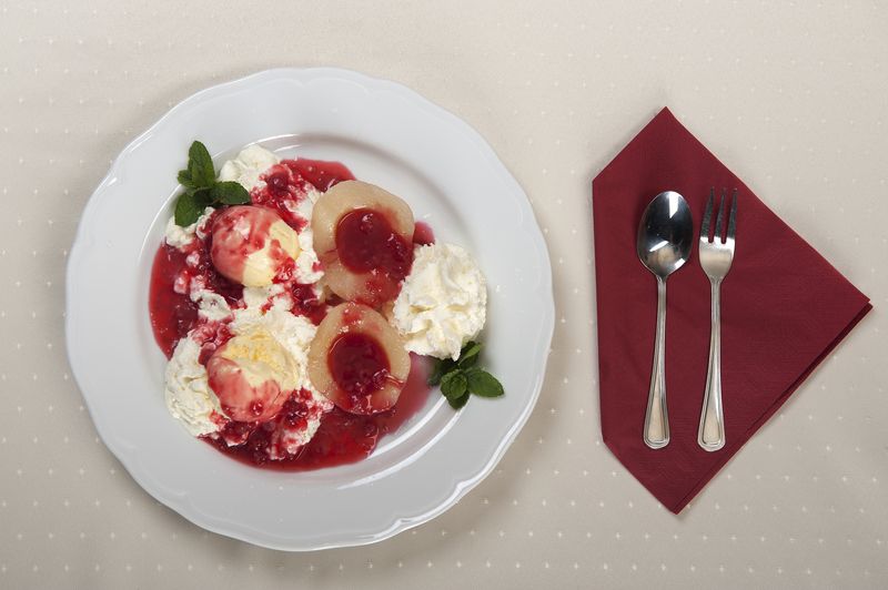 Ciekawy deser z wykorzystaniem gruszki podaje Restauracja Dwór Bismarcka w Mysłowicach. Tamtejsze gruszki w zestawieniu z goracym sosem malinowym to prawdziwy hit.